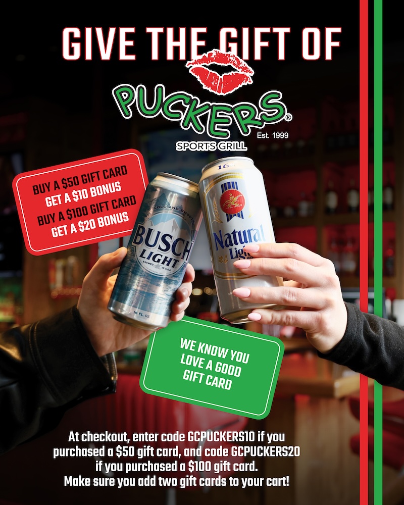 Give ’em what they really want, a Puckers gift card! For the rest of this month & next month enjoy our gift card promo: